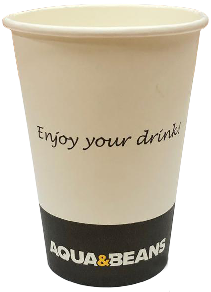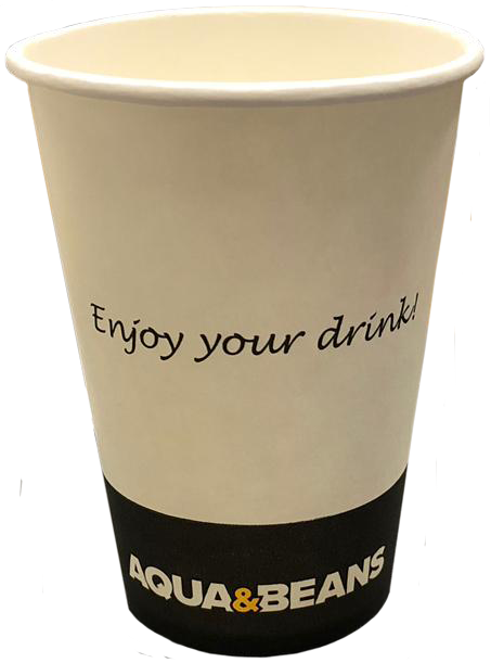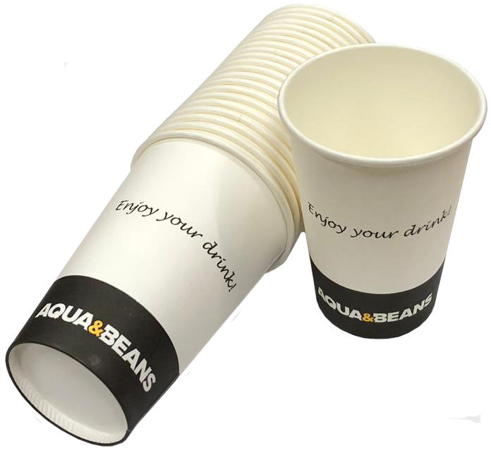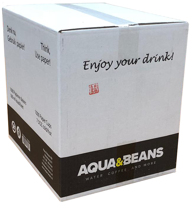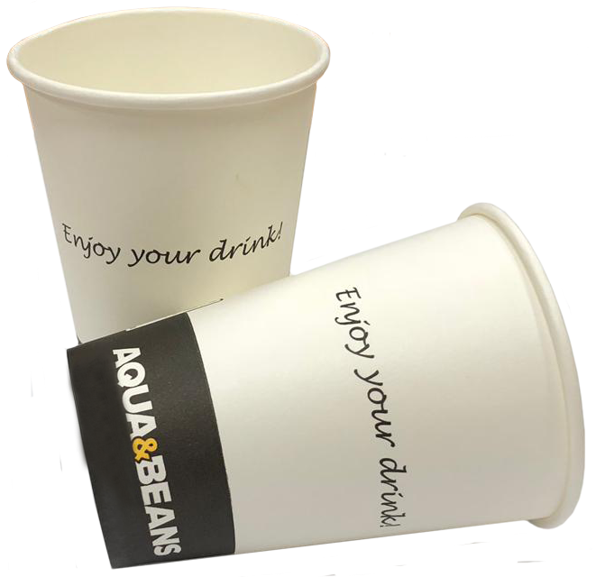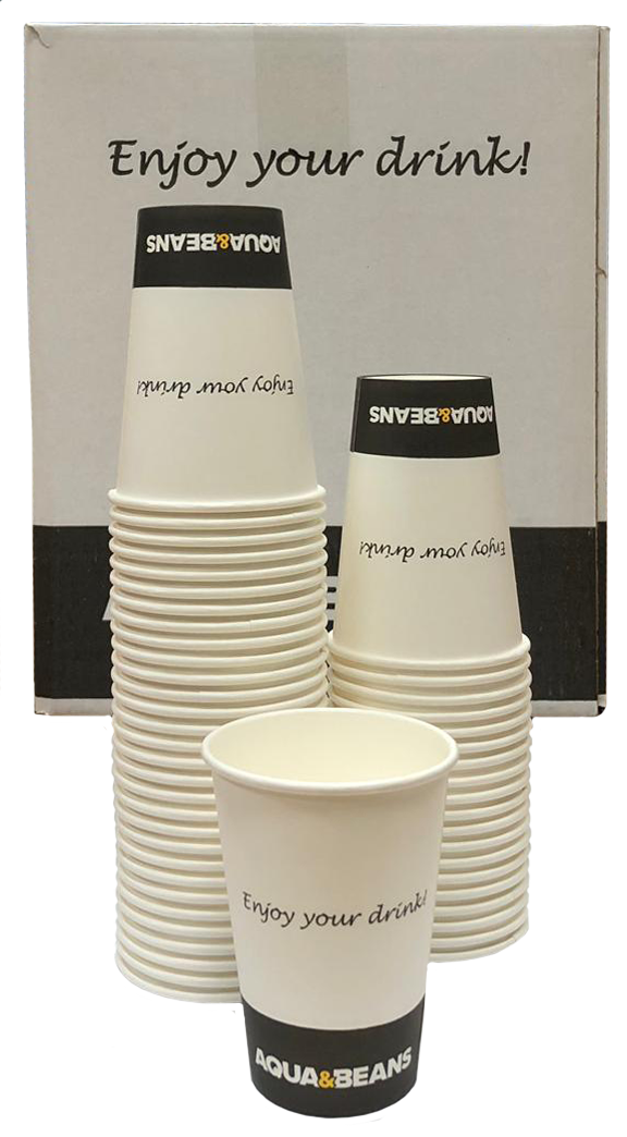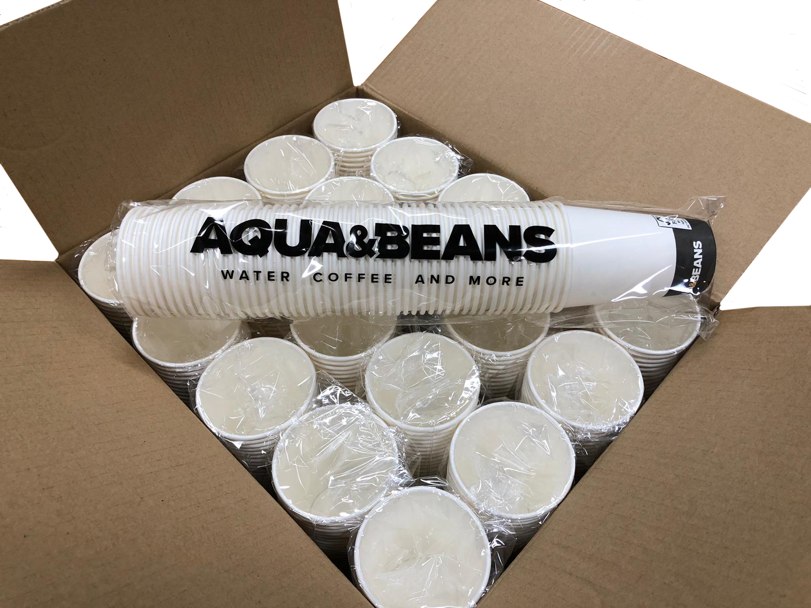 Aqua & Beans drinkbekers (180 ml inhoud en geschikt voor zowel water als koffie) van karton/papier van sublieme kwaliteit. Wilt u ook iets doen aan een beter milieu, gebruik dan papier in plaats van plastic bekertjes.