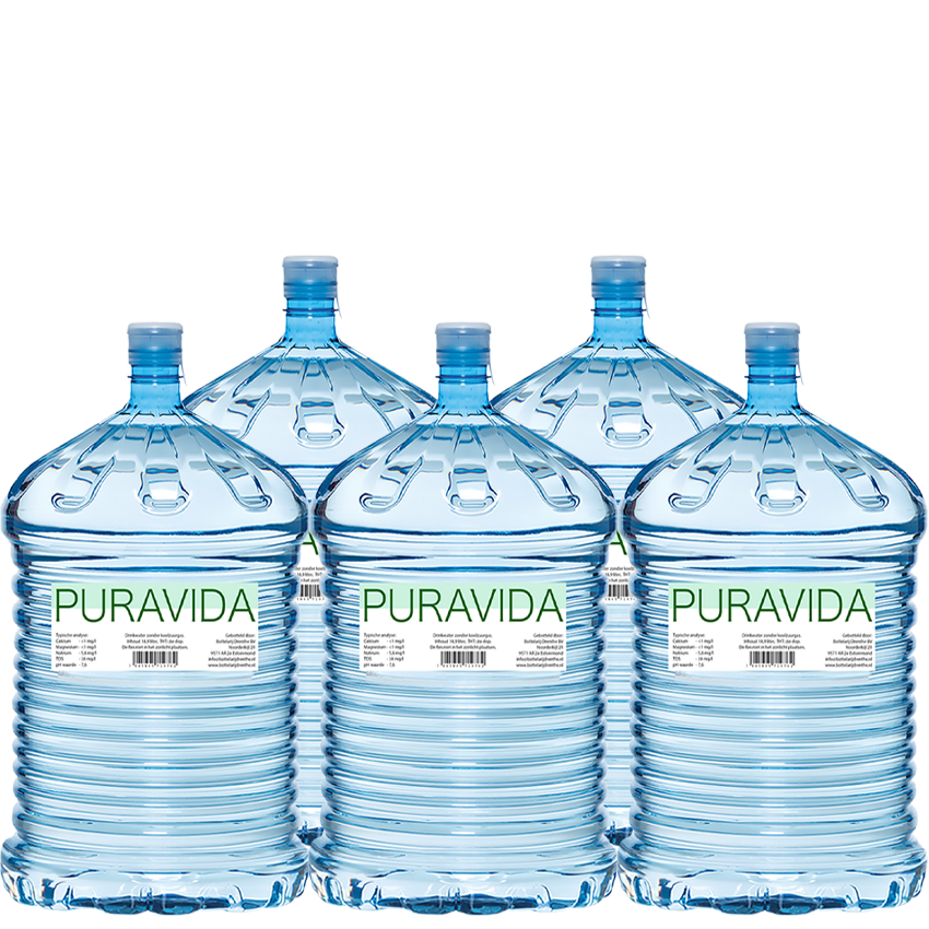 Het water van PURAVIDA wordt geleverd in eenmalige solide PET flessen van 18,9 liter die biologisch afbreekbaar en recyclebaar zijn waardoor ze uitermate milieuvriendelijk zijn.