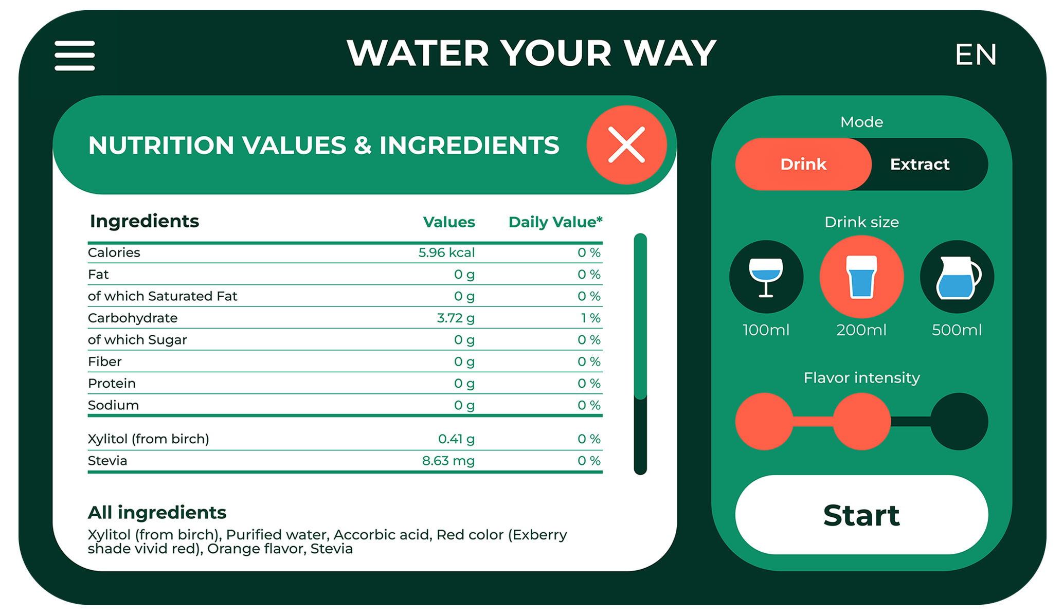 Via het gebruiksvriendelijke touchscreen kies je eenvoudig jouw drankje. Vervolgens personaliseer je het met natuurlijke smaken, vitamines of een cafeïneboost. Tap & klaar.