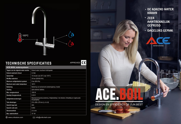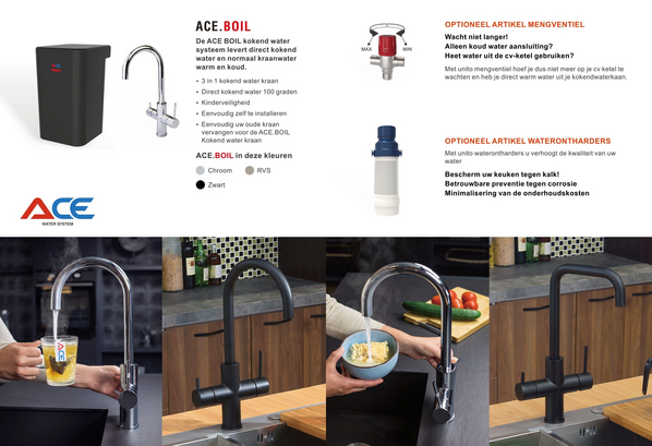 De Ace Heet Water Kraan is gemaakt van moderne materialen die in elke keuken passen. Of je nu een op zichzelf staande kraan wilt voor alleen kokend water, of een Ace-product wilt integreren in je bestaande kraan, wij hebben alle producten beschikbaar die je daarvoor nodig hebt. Het slimme en strakke design van de kraan zorgt ervoor dat de kraan in elke keuken past en niet eens zo opvalt. De moderne materialen en stijlvolle kranen spreken iedereen aan. Extra info