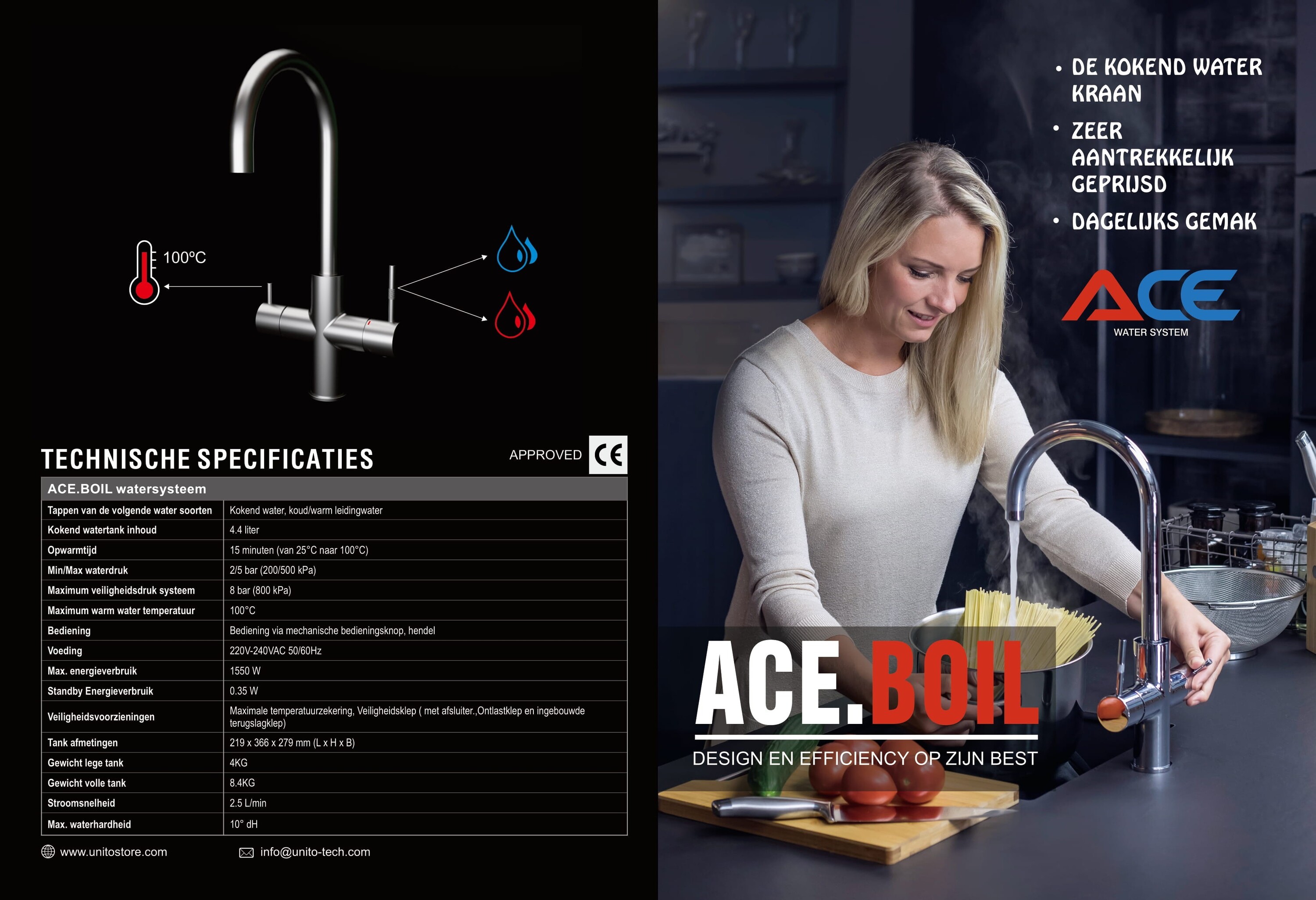 Met de ACE BOIL | 3 in 1 kraan heeft u de beschikking over uw gewone warm en koud water kraan alsmede de extra functie van kokend water (van 100°C).
