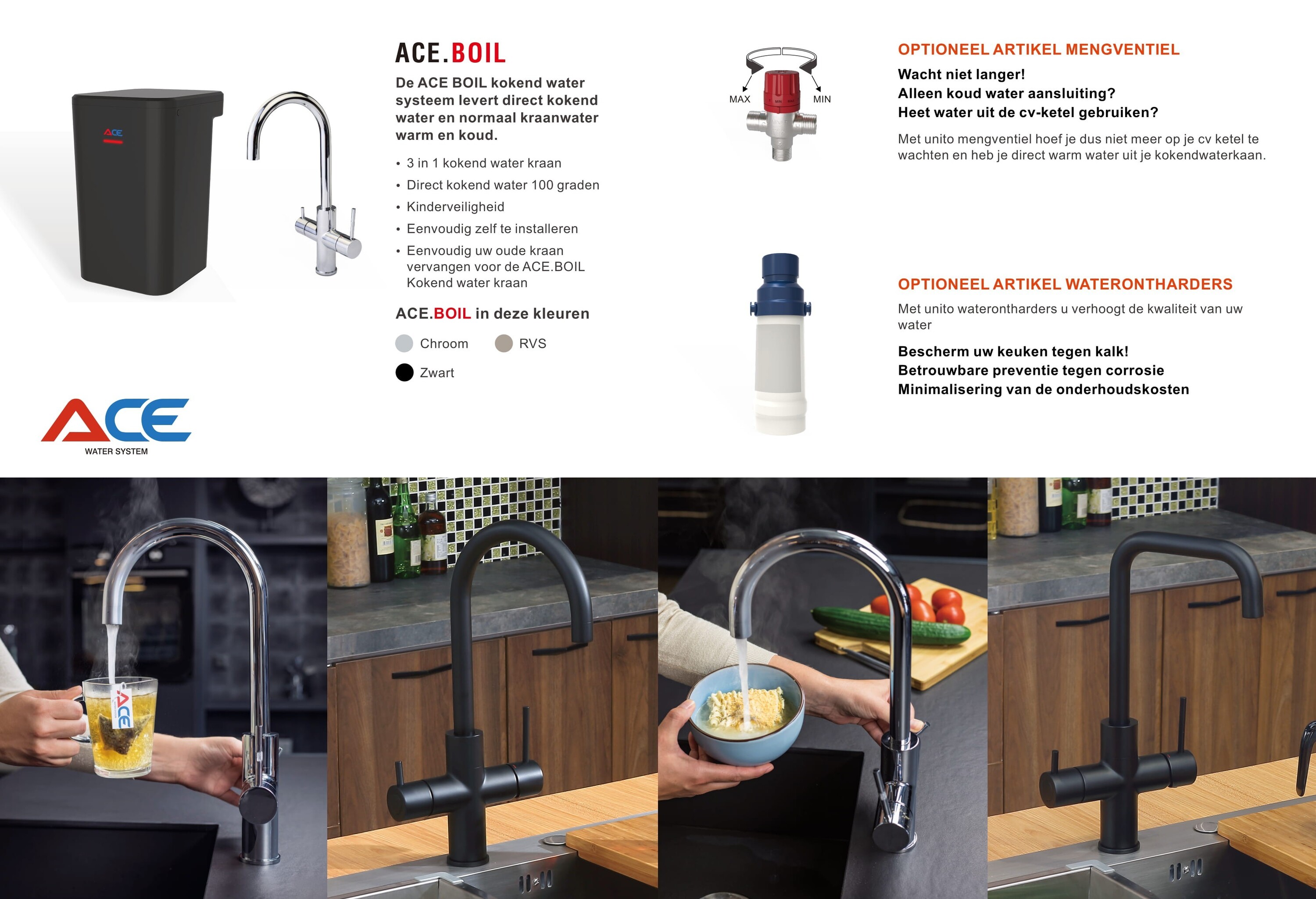 De Ace Heet Water Kraan is gemaakt van moderne materialen die in elke keuken passen. Of je nu een op zichzelf staande kraan wilt voor alleen kokend water, of een Ace-product wilt integreren in je bestaande kraan, wij hebben alle producten beschikbaar die je daarvoor nodig hebt.
